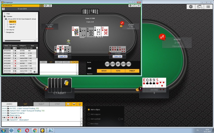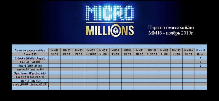 RubAka @ 2.11.2019 Условия пари по Омаха Х/Л Турниры для участия(время Новосибирское, будьте внимательны!) Из 12 турниров по хайле(список приведен выше) необходимо отыграть минимум 8! Если меньше, человек считается автоматически проигравшим мазу и должен перевести выигрыш победителю, если сыграно больше то в зачет идет 8 лучших результатов. Победитель мазы определяется по сумме лучших мест в 8 турнирах, например: Первый участник занял места 1, 28 и 17, а второй участник - 14, 12 и 13 места. У первого сумма мест 46, у второго 39. Второй победил. Ставка 25$.
