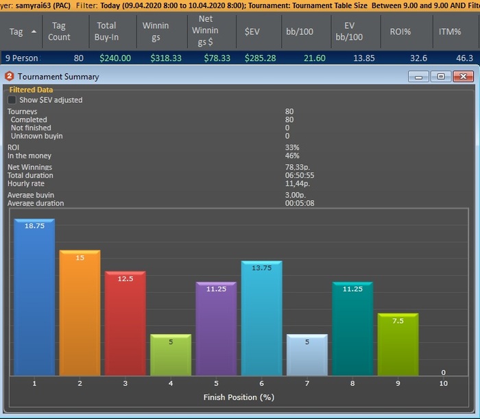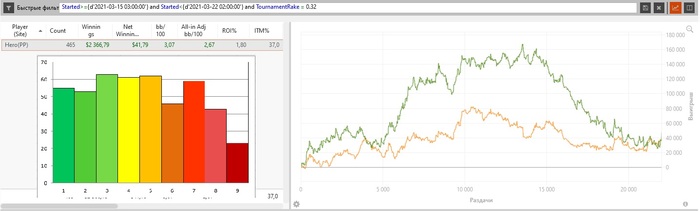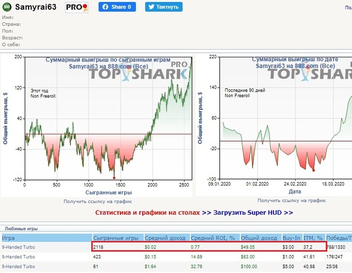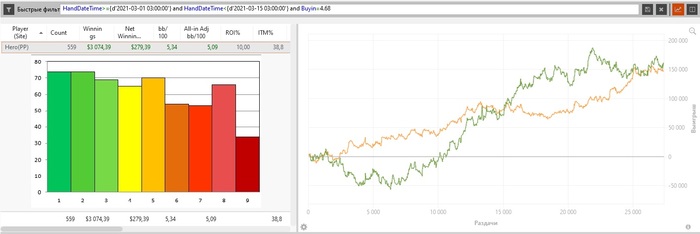 Samyrai63 @ 8.4.2020 Немного о пати. Вот так поиграл 2 сессии: Вместе с халявными 20$ пати включили мне "God mod"... на пике профит был 170$(ROI под 50%!), а потом так же внезапно отключили и за последние 15 туриков одно 3 место и то по случайности - шел коротышом в 5 мах, и чипак выиграл тройной all-in. Немного офигел от таких качелей. В целом играть на пати очень выгодно. Если играть 280снг по 5$ в неделю, то получим: 1. +20$ кешбэка 2. ~ +20$ за место в еженедельном лидерборде. (этой дитанции хватит на топ-7 примерно) 3. Рэйк на пати на 5$ лимите: 0.36$ вместо 0,5$(или 7,2% вместо 10%). Следовательно в среднем будем получать по 0,14$ за каждый турик сыгранный на пати вместо 888. итого ~ +40$ или 2,8% ROI ! (на самом деле это будет зависеть от распределения и количества ITM. то есть мы будем выигрывать больше, а не проигрывать меньше. И чем более плюсово ты играешь тем больше этого "халявного" роя будет). 4. На GT c пати начисляются GTpoints. (100$ htqrf - 1 gpt). 1$ в неделю. Мелочь, но приятно)) на кэпшн или что-то подобное хватит. На 888 за это время и дистанцию мы получим ~ 500 проклятых токенов (5$) и кучу ненужных билетов на фриролы. Ну иногда бывают, кстати, нормальные фриролы - но это редкость. В итоге: + 75 $ в неделю, если играть такой лимит и дистанцию не на 888, а на пати (5% роя !). 300$ в месяц, не считая, собственно, профита от игры. Заманчиво... НО нет возможности анализировать свою игру. Вот и думай... профит или развитие.