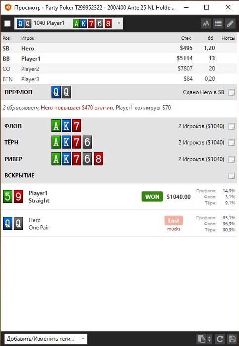 А за другим столом одновременно с этой вот такая. Коротыш на SB АФК! Опп долго думал и нажал колл. В такой ситуации учитывая, что коротыш афк там наверно даже тузы не колятся... ну ладно АА, КК, QQ, я бы даже AK простил, но это просто дичь. При том что опп - РЕГ с роем 3% как у меня! :
