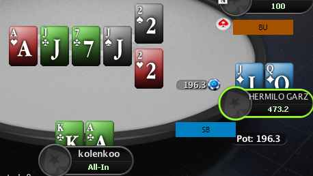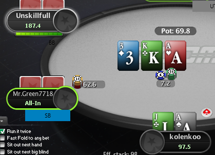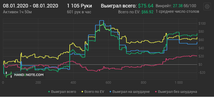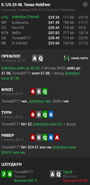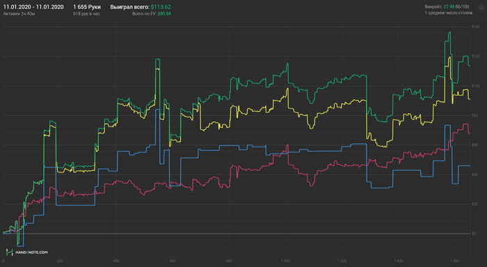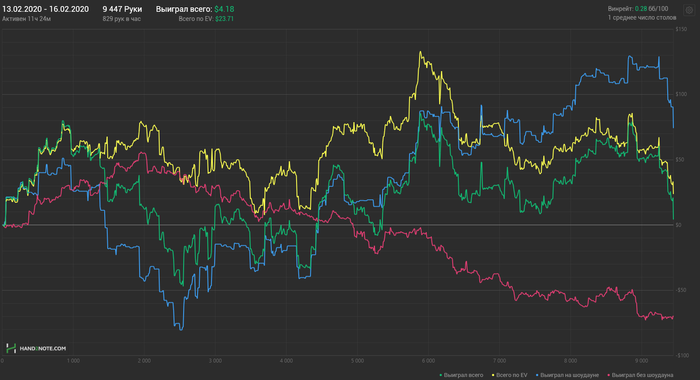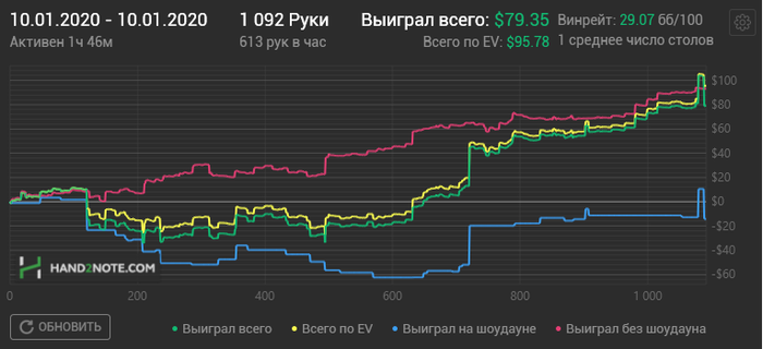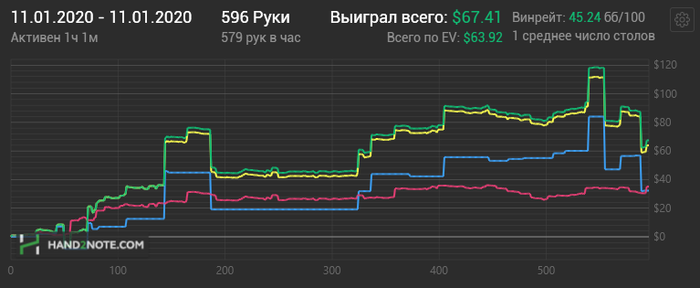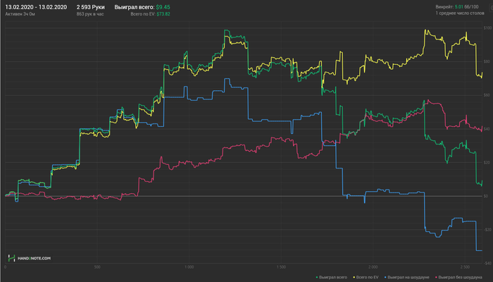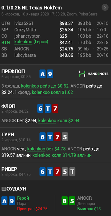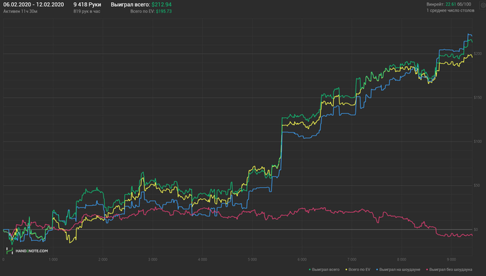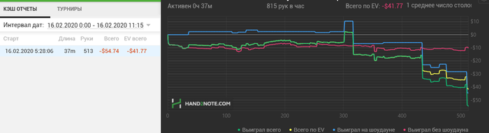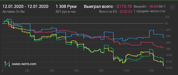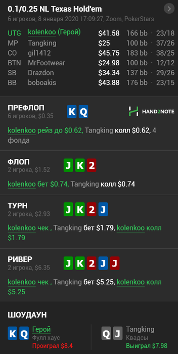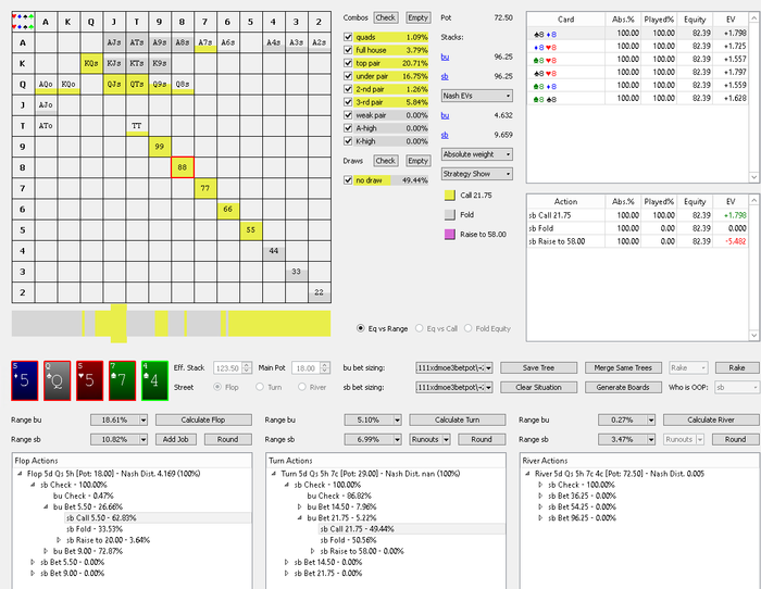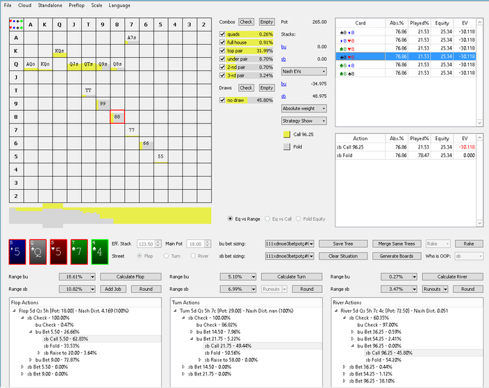 Hudson, Не сохранил файл с расчетом, но если коротко по колу: если считать по моим ренжам и брать эффективный стеки ~132бб, то кол нулевой, но солвер на терне АК вообще не ставит, т.к. считает, что это шд велью (блокеры на блеф и велью не считаю), поэтому у него будет перекос в сторону блефов и кол будет слабоплюсовым.. Если считать ренжами ММАшера, то кол чуть более минусовой.. но я не играю по его ренжам, поэтому не могу сказать почему так.. Видимо его ренж (3бет бб вс сб) подходит лучше под этот борд. В 100 бб по такой линии кол немного минусовой, но я не уверен, что он, играя в 100бб стеках лупил бы пот по терну.