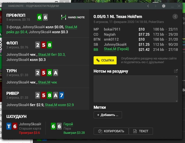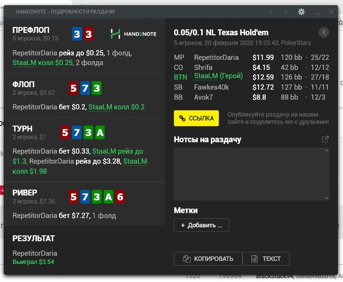 StaaL, в норм диапазоне узкого колла на сб в мультипот там только 66 можно по такой линии предположить, но мб он "превратил в блеф" или наоборот слишком лузово собирает велью с сетом младше типа 77, даже иногда 55(хм, велью с такими руками? с чего? оверпар у тебя чуть не ноль тех же). 86с, А6с - сомневаюсь, что он такое коллит, всё же статы 30/18, а не 60/18, 63с - вообще смешно, 9х руки и ТТ+ отметаем тоже, 76/65 на сб почти не коллят. Выходит да, плюсовее всего было ехать на терне - сеты платили б, а карманные шестерки тоже не факт, что б уже скинул, мог бы и переиграть, но лучше было не сразу пушить, а сделать хитрее - "мув Блэкстэка" - плоский перекрут, вот где б и шохам было б практически нереально отскочить уже