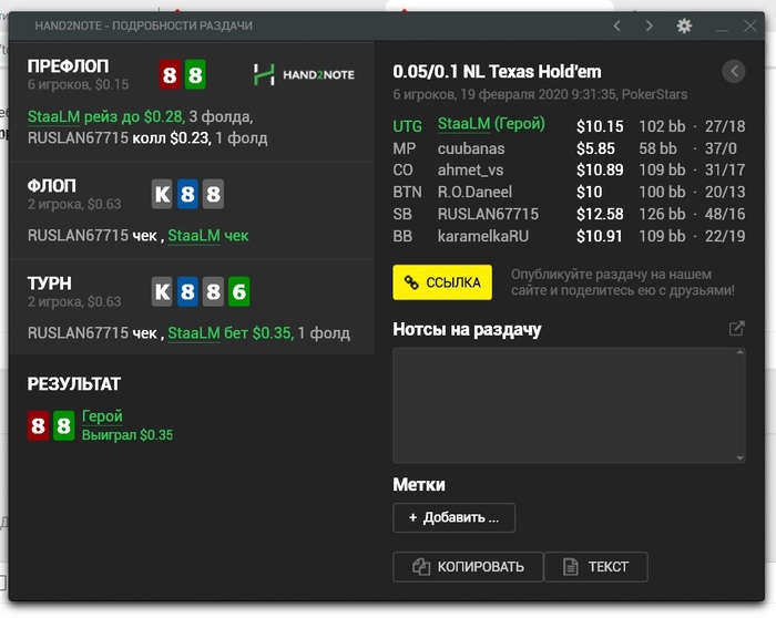 StaaL @ 19.2.2020 Отыграл серию Баунти Билдер, в итоге в небольшой минус. БР есть 300+, начинаем катать потихоньку рег-столы НЛ10, буду подмиксовывать с зумом НЛ2/НЛ5/ПЛО2/ПЛО5, если играю с телефона.