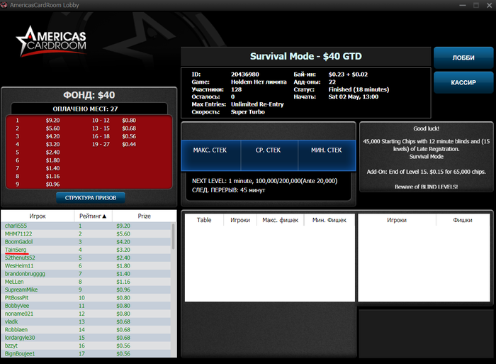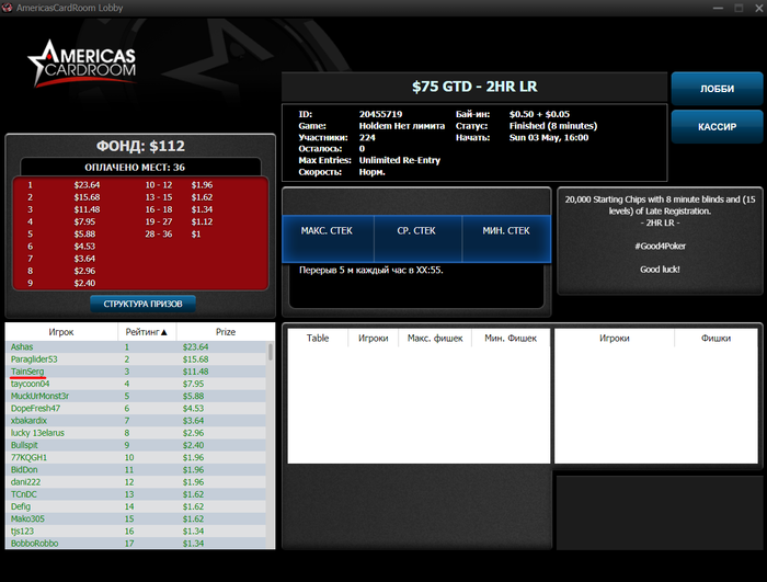 Сегодня сыграл в 0, если бы не последняя финалка, то мог бы закончить в минус. Самая лучшая сетка там - это ночные-утренние турниры, поэтому залетаю в 03:00 по МСК на основные турниры - всего отыграть планирую 30 туриков. Если завтра не отписываюсь в блоге в 03:20, что сел за катку, то закину первому заметившему здесь 5$ на ПС.