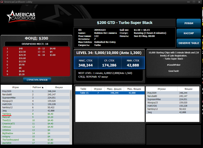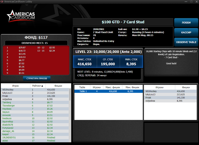 Привет! Как у тебя успехи? Хочу оставить на AC банкролл для катки, потому что поле здесь хорошее. А остальное вывести и перенести на 2-3 рума (по 150-200$ на каждый рум) и пробовать. Для 1$ 180мах думаю придётся вывести почти весь нынешний мой BR. И если честно пока что на AC мне катать очень комфортно.
