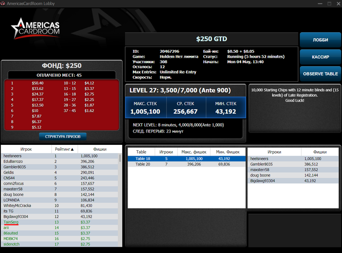 TravienMcRoy, да, я там играл. Примерно 200 евро там выиграть получилось в МТТ (около 150 вывел). Но пока что торможу переход на другой рум. Не хочу 100% выводить и депать в другом рум. Нужно набить 600-800$ и разбить на 2-3 рума хороших (чтобы отыгрывать больше дистанции). Спасибо за обратную связь!