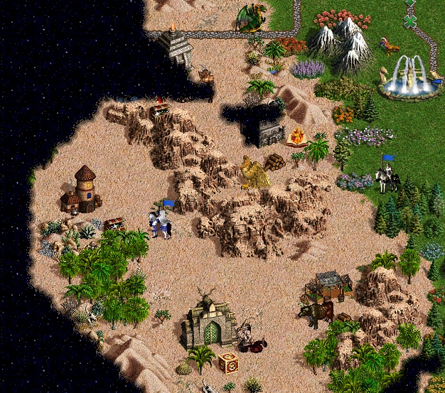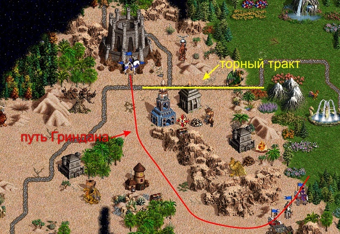 На 123 наши добрали еще 2 заставы и консу (из трешки получилась двушка, так как брал лошок без земли), вышли, пробив без особых проблем никсов, в центр (5 ангелов, 21 циклоп, пара метеориток, залили одного ангела на морали). Засветил центральный город, удобную утопу и ряд приятных артов: Опп забоялся грин драгонов и пошел бить альтернативное ГО из лошадок по бездороге. Почему то так и не добрал вторую консу. На этом этапе получается он уже прилично отставал (фактически на 2 дня с учетом синего цвета и предстоящих песков). На 124 взял центральный город, построил таверну, немного разбежался, засветил КВ и сапоги странника, Гундулу с фейлом (на таймере не туда передал чайник и доспехи) разбил домой пополнять ману (итог 80 маны вместо 150). Вообще мув был рискованный (оставлять лошка с армией в центре), но вроде я разведал обе дороги и не должны были до меня добегать, но на ТП маны не было, а строить гилду в ущерб разведке не хотелось. В это время несчастный Гриня ползет по пескам без разгона: К тому же он добрав вторую консу (тоже 3ка, стало 6 ангелов), каким то-образом умудрился попасть в ЧП и, видимо, залить их на аспидах, ангелов осталось снова 3.