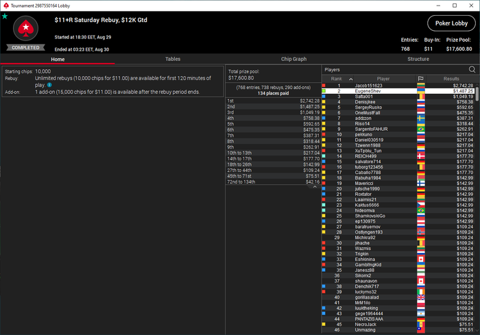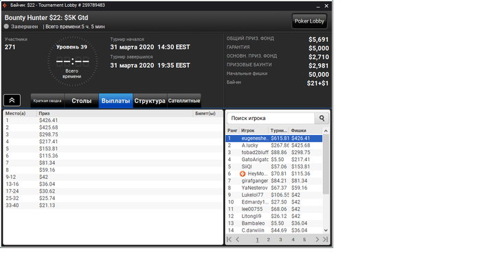 5). Победа, на мой взгляд, в достаточно скиловой субботней 22й потасовке на старзах. В 20м году припоминаю еще 3 выхода за финальный стол в идентичном турнире.