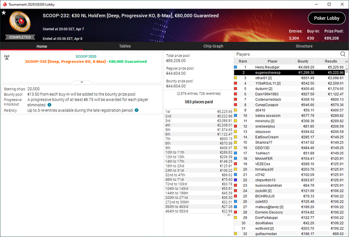4). Второе место в серийнике по 30 евро на евростарзах. Достаточно плотная по составу финалка. Длинный ХА с неуступчивым любителем. На начало его я уступал по фишкам 1 к 5ти. Решающее выставление проиграл, имея практически равные стеки. Это была так называемая ооочень приятная распечатка рума.