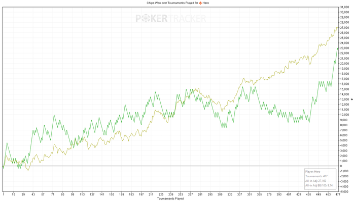 Первые турниров 100 всё шло +- как обычно, потом стал влетать в кулер за кулером, а в конце уже просто хотелось побыстрее закончить сессию, и несколько коллов были явно лишними (хотя, справедливости ради, большинство из них было префлоп с 40+% эквити, а постфлоп я влетал в условные КК, чекнутые с ББ в ответ на лимп на 16ББ).
