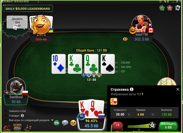 И так, начнём с того, что на покерке страховка предлагается на тёрне и ривере. Более конкретно