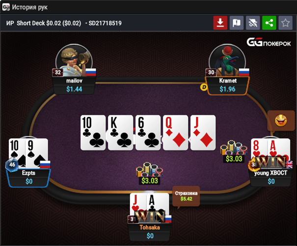 Мы попали на стол, где 3вей олл-ин было нормой и стеки летати туда сюда, однако атмосфера стола была отличная, да, мы в минусе, но утро было отличное!