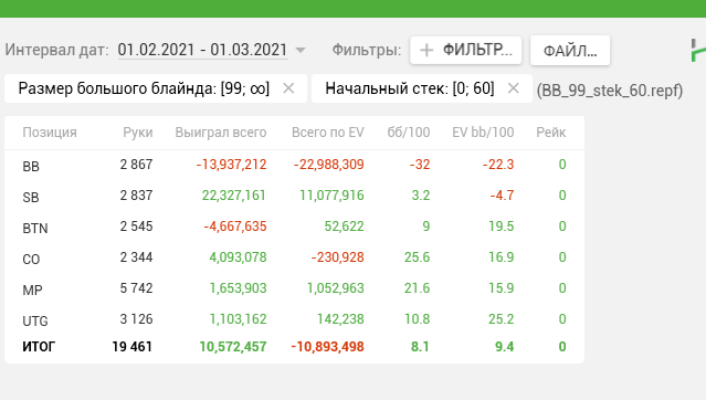 На самом деле ВРы были выши, в конце месяца было очень много кулеров и дисповых раздач из-за нокаутов, часто катался снизу за ноками, было порядке 14-ти на фильтре 100 и порядка 10-ти на фильтре 90-60, конечно же еще есть много над чем работать, на данный момент цель уже бить АБИ 15-20, с АБИ 10 быстро справились ) Много писать не буду нет сил, мыслей, думаю тут и так все понятно по скринам что прошел март, сыграл относительно немного вначале месяца были дела и не играл почти неделю - полторы, всем удачи за столами!)