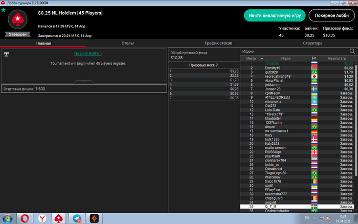 Приветствую.. )..сыграл турнир за 1.1$ c гарантией 2к..был 18 по стеку..но мои АК не устояли с ТТ..) ,..но думаю на днях должен в топ 3 попасть)!