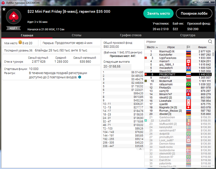 Максимальный стек был 900К, примерно 15 минут я шел первым в турнире, но потом подзалился немного) Попробуем затащить сегодня!