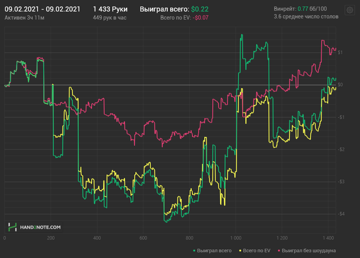 Короче, хотел опубликовать плюсовой график, но вчерашний даунстрик с тильтом (или тильт с даунстриком) немного повлияли на результат. В итоге публикую что есть. Последняя тысяча рук - утренняя сессия. Продолжаю вычерпывать воду с корабля.