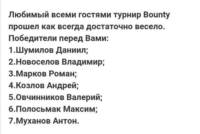 И поспешим отметь поздравлениями участников вчерашнего турнира баунти. Для тех кто не успел вчера узнать результаты, вот они сильнейшие "охотники за головами"