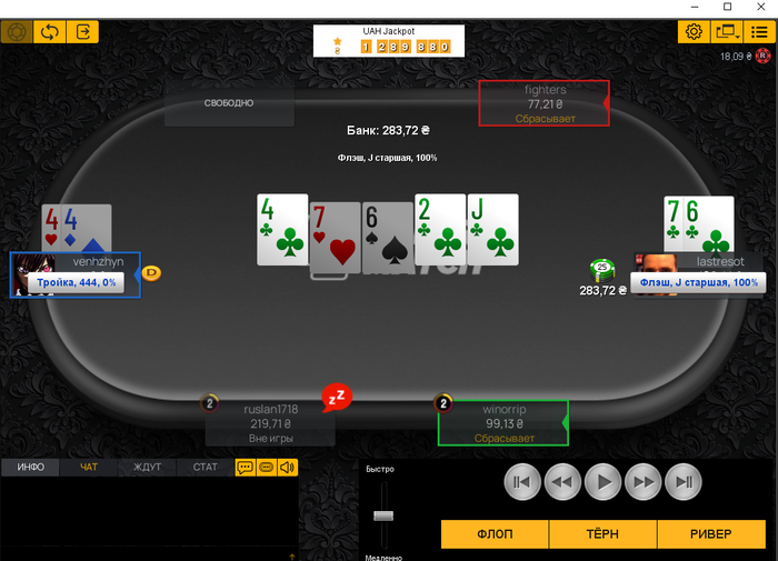 Положим в оленя он не ушел. Доска наша. 40 процев от банки кидаем. Он скорей всего в оленя (хотя, может и решит что самый охуенный и начнет телефонить) и мы принимаем. Если телефонит, по такому терну кидаем 60 процев банки. Наш расклад на его карты - на сеты кроме младшего (как и есть в натуре) не кладется, либо слабый туз и он по нижней попал (в такой ситуации на микро редко кто выкинет), либо тупо тащит мастевый бродвей на мусорной доске.