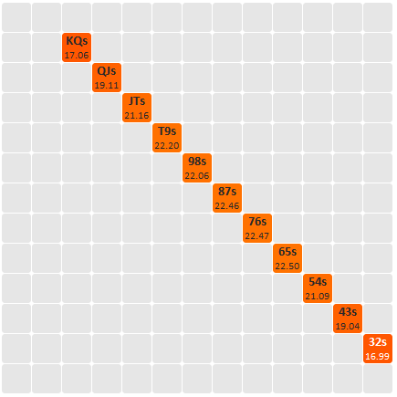 Вы, конечно, сколько угодно можете ещё предложений накидывать (то у вас игроков несколько, то у вас процент на улицах меняется, то почему-то рассматриваем эквити тузов против диапазона и т. д.), хотя условия с самого начала были обозначены чётко и понятно. Ну давайте, ещё про масти поясню - нет здесь никакой игры мастями. Есть матрица на которой показаны эквити одномастных коннекторов против тузов. Это эквити не зависит от масти.