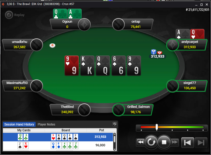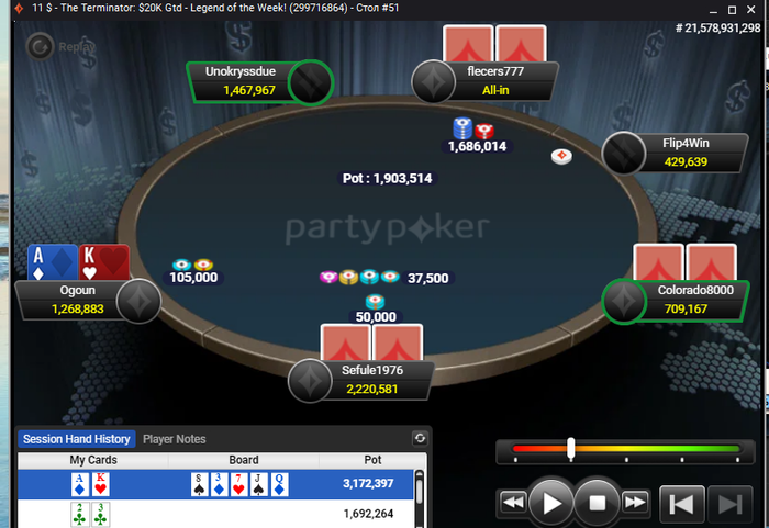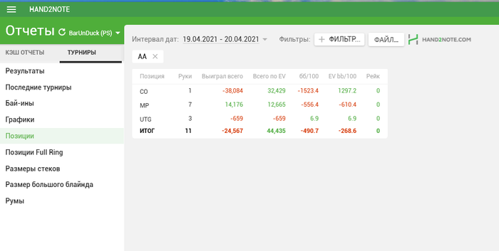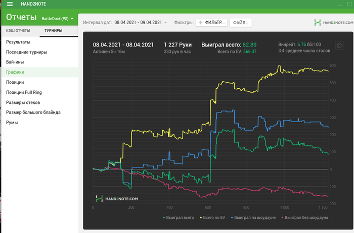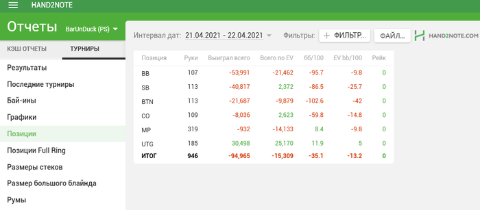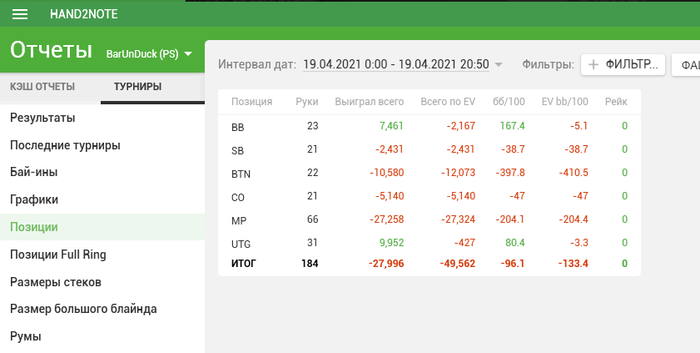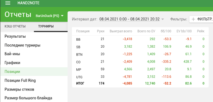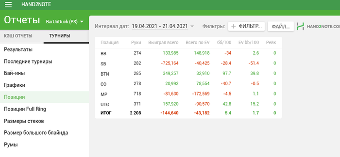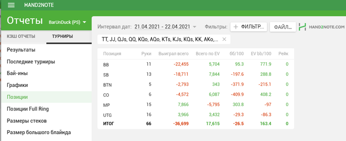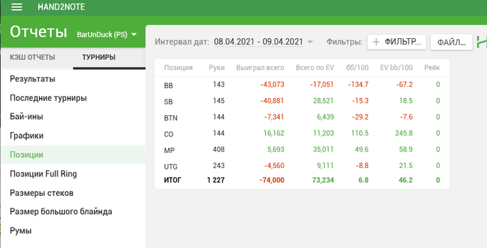 Сессия закончена. 10 минусовых сессий подряд. Сыграл сегодня свою лучшую сессию по игре за все время, плотно шел в 50-60 блайндов, под конец в последних регах уже психанул и поехал на любых картах похожих на руку или даже ногу . И худшая по удаче, как же не прет та, ни одного выставления в диапазонах 55-75% с свою пользу не выиграл, только на блефах и только на шоудауне по риверу забирал.