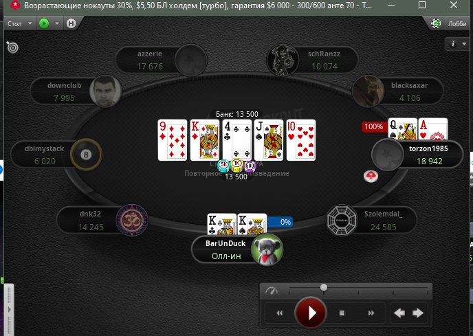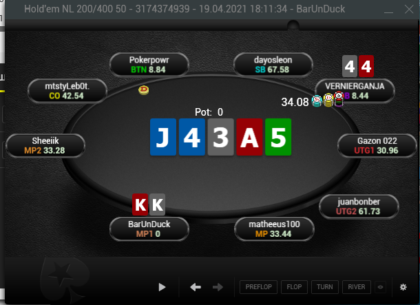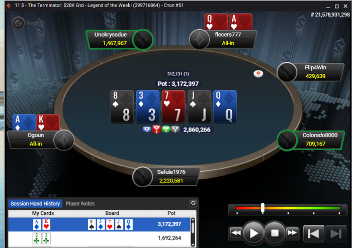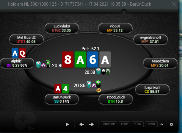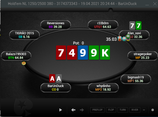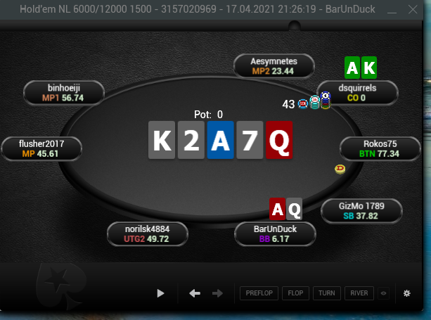 АВр на бб в тузы с катоффа с самым коротким стеком, до этого с чип стеком проиграл КК в 33 и следом с валетами в 3-вее префлоп с КДр и АДо.