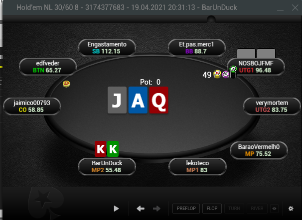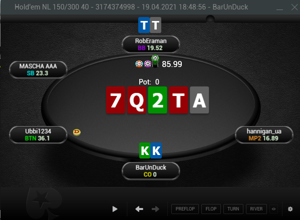Были интересные раздачи, вот эта меня заставила задуматься, как-то странно баттон мин3бетил префлоп и закладывал ему по такому сайзингу только тузов и королей, поэтому по флопу нашел легкий фолд