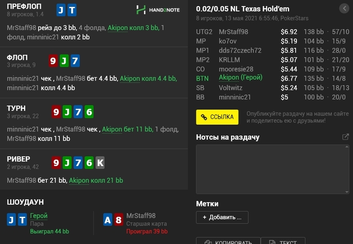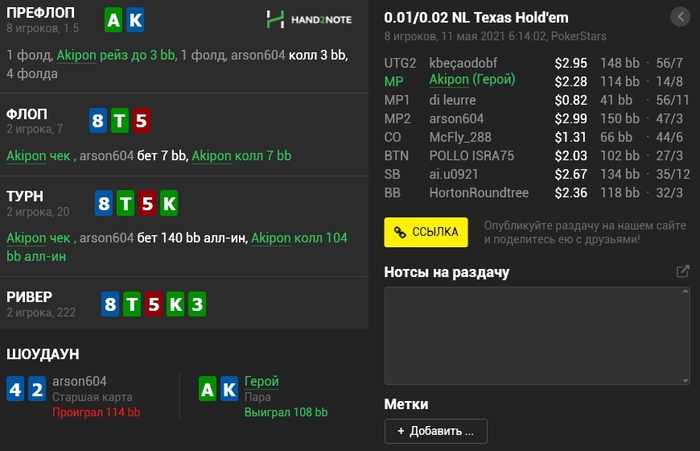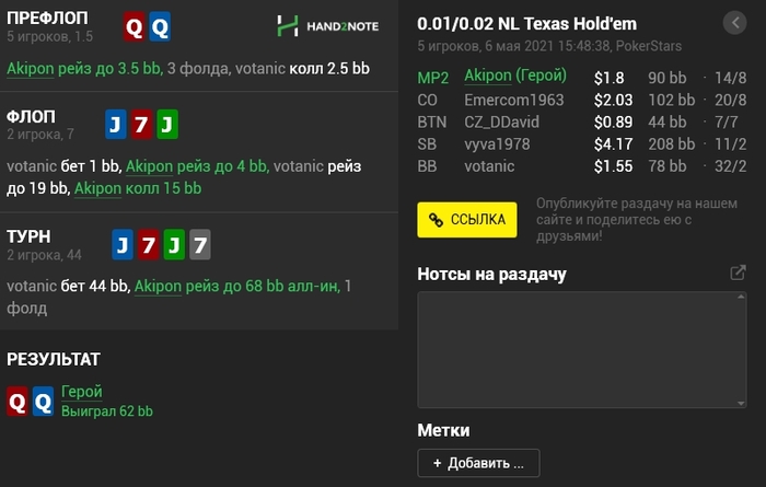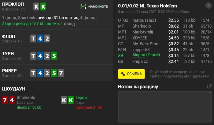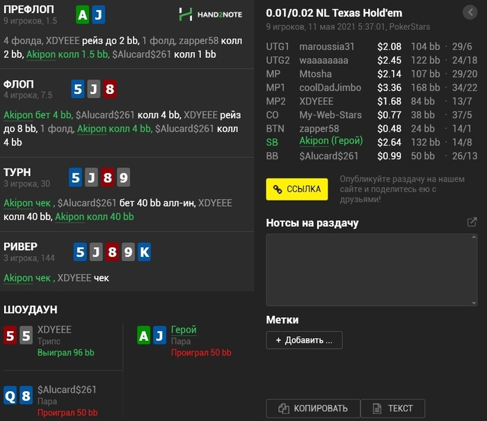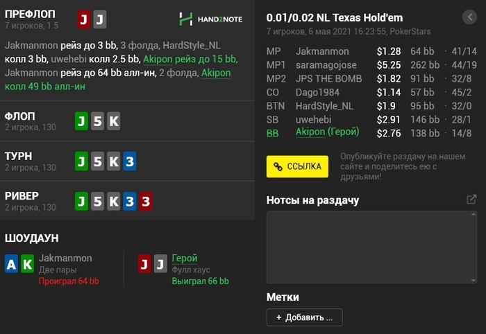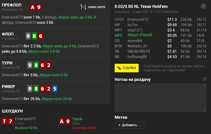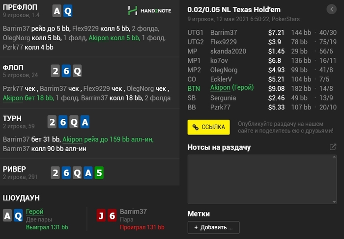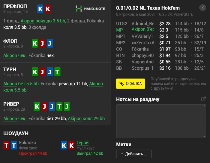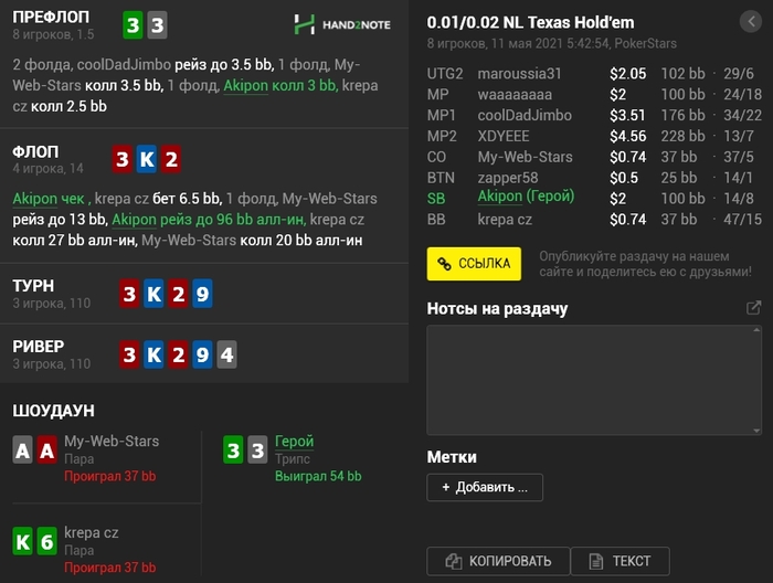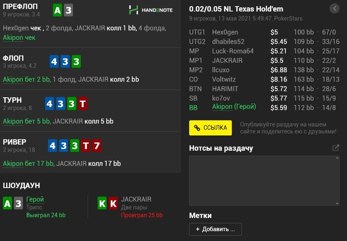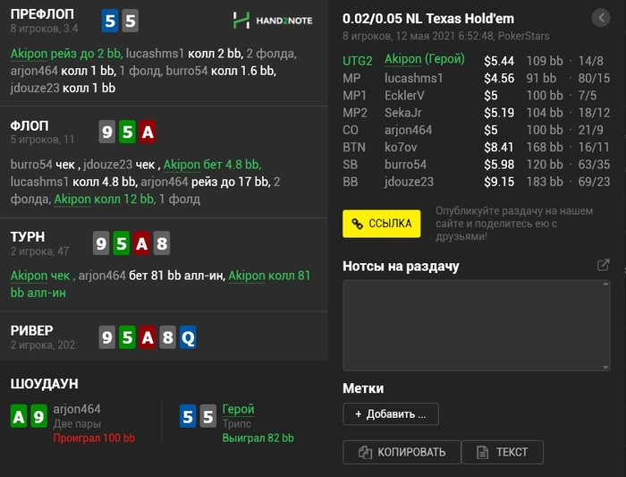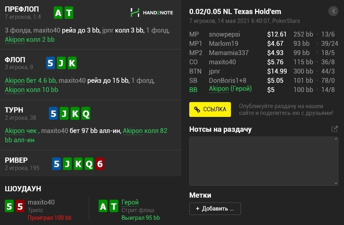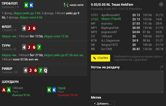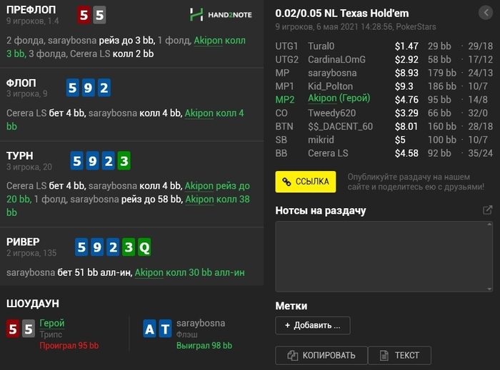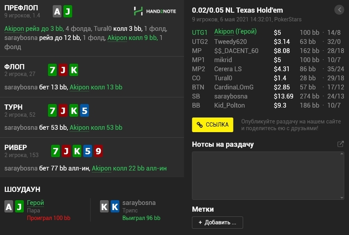 Panda_gerrard @ 06.05.21Не знаю тонкостей 9-макс игры, она в целом диковата для меня, например КК кол 3-бета, а не 4-бет, но вроде у вас так заведено. Но с КК и 55 вроде обычные куллера, не более) а с AJ изи пас префлоп даже в 6-максе, но я так понимаю это был тильт уже)
