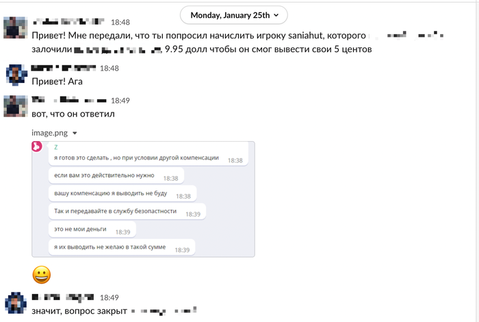 Начинаю верить, что есть люди, которые не знают, что в мире есть скриншоты. Диалог из внутреннего чата о пяти центах и начислении суммы до минимального вывода за счет рума. Игрок отказался, потому что требовал компенсацию другого размера. Закройте тему, пожалуйста. Клоунада же.