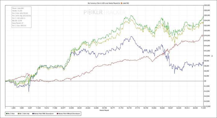 Радует пара вещей: играл действительно неплохо по ощущениям. За исключением одного маргинального чек-пуша терна с дровами, когда надо было отскакивать против рега в 3б поте из-за его конского сайза, по которому сильно часто будет сила. Ну и 2ое, наверное, самое главное на текущий момент - не возникло состояния "да как же достал этот покер"... обычно как раз после таких дней и начиналась вся хуеверть в голове в духе "зачем я вообще играю".