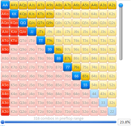 Ты, кста, че над префлопом так заморочился? Есть же готовые рабочие варианты, упомянутый Инвокер говорил, что идеальный префлоп даст мизерный выхлоп. На старте надо просто понимать примерно диапы свои ( ) и поляны, какие руки есть, каких нет а какие плюс минус могут быть.