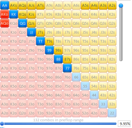 Десяток у агрессивного оппонента мало, только слабые (T8s, T7s) и фулл (T9,). Так же есть 99. потому что 3бет низкий. Дам много: это QJ, KQ, QT. А так же есть стриты KJ.