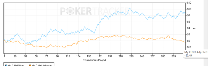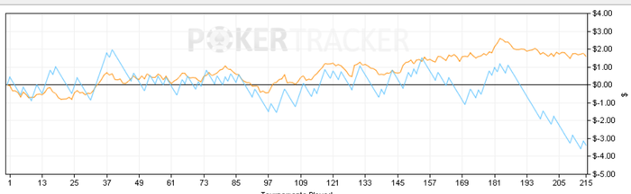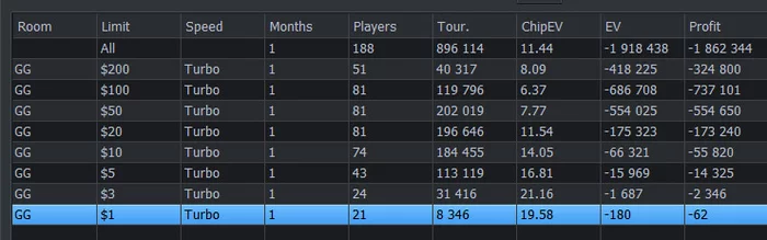 вбиваешь свой лимит и кол-во турниров и смотришь своё $ев ожидание, скорее всего в пт4 показывает что-то не то, для игры в 0 тебе требуется 27 фишек