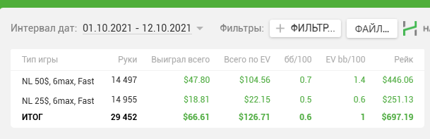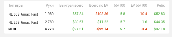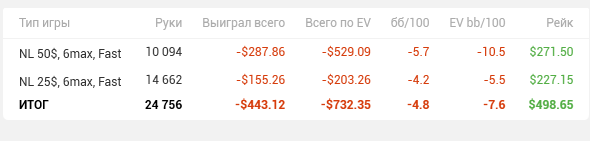 Рейк получился совсем. 6 бб/100 на полтосе и 6.5 на 25-ке. Видимо я играть стал тайтовее, хотя на результатах это сказалось в минус.