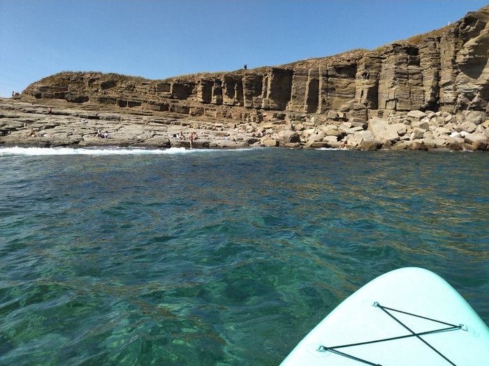 Накачали мы лодки и начался заплыв. На Сапах катаются стоя, обычно. Но учитывая, что трое из нас катаются на них впервые, нам троим, с горем пополам удалось грести сидя на жопе/на корточках, периодически меняя позы, чтобы ни чего не затекло. Плюс волны и неспокойное море у мыса — не дали бы постоять, уж точно.