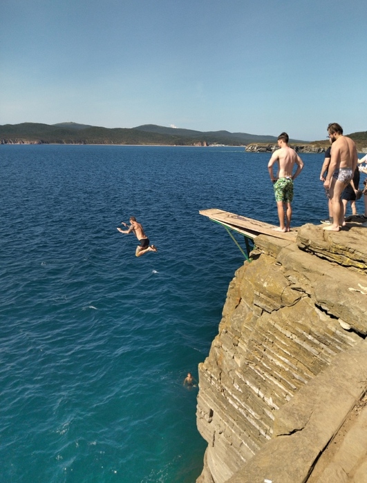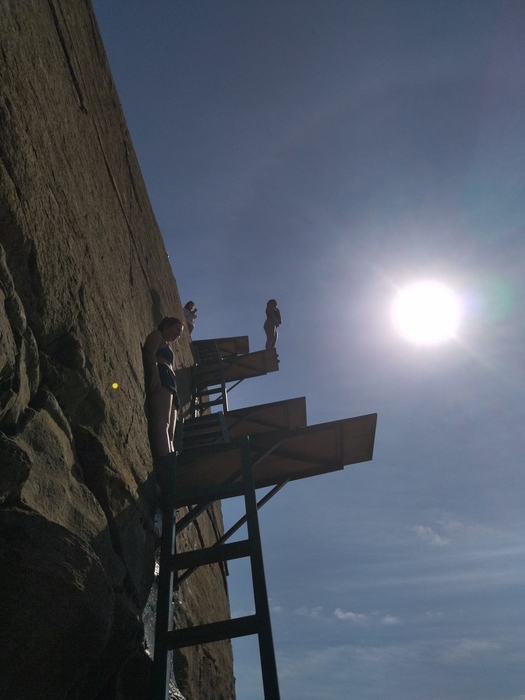 Наш претендент на нижней ступеньке. Высота 4 метра, но это кажется, что немного. Лично я ни разу не прыгал с высоты в воду. И даже мне было сыкотно стоять на нижнем трамплине. Она прыгнула, а я постоял минут 10ть, уговаривая себя, но так и не решившись погнал загорать.