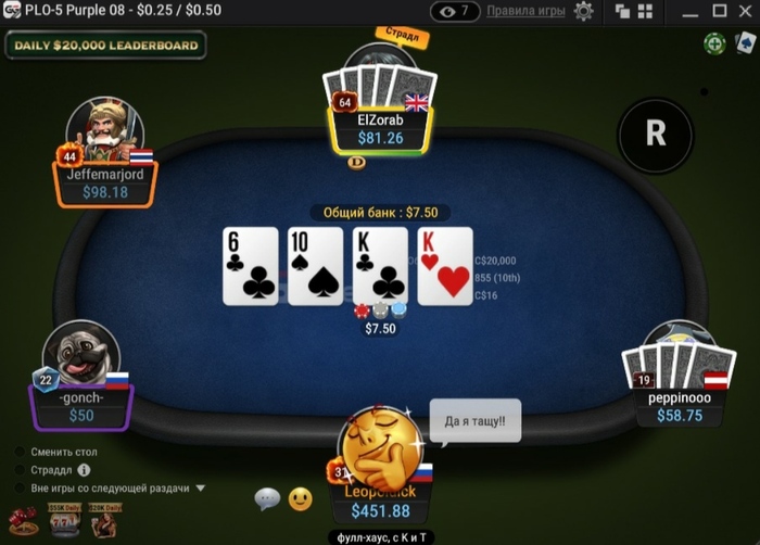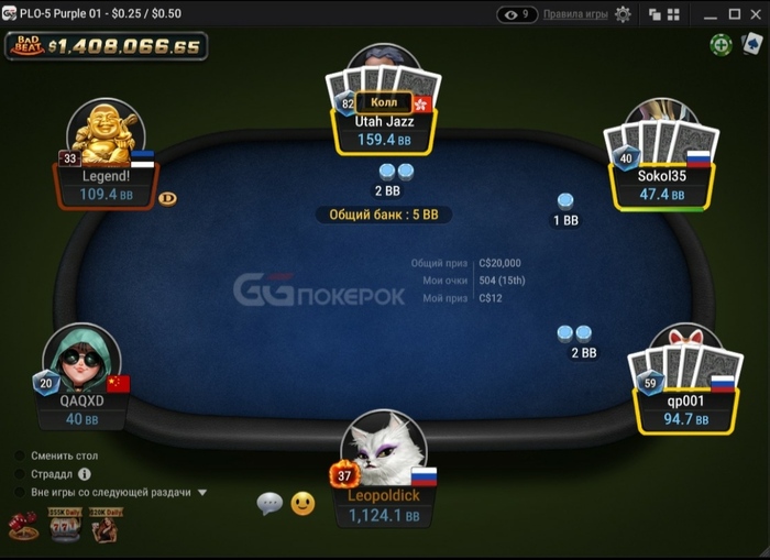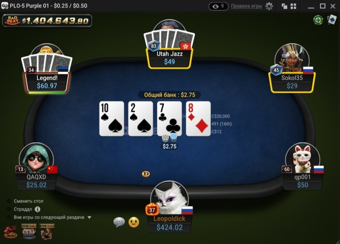 Играл я кэш Омаху5-хай PL50, с банкроллом 500$. А 500$ за столом, это на секундочку, весь мой банкролл, в какой-то момент, и 1000бб.
