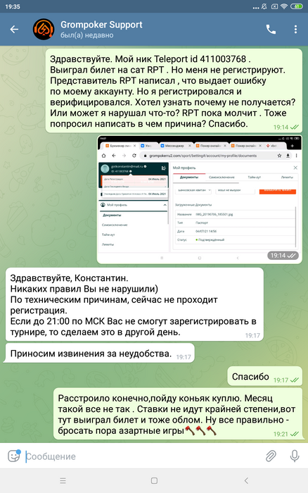 Вам же отписали что были технические проблемы с вашим аккаунтом, Grompoker зарегистрируют вас в субботний сателлит, он еще ценнее, так как это сателлит с пакетами на главное событие Гранд Финала с проживанием и расходами на перелет.