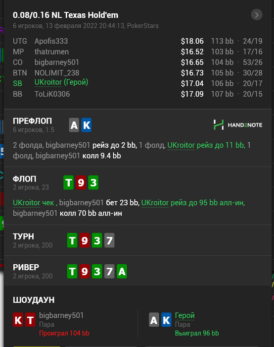 По второй раздаче, я сам делаю и у других замечал, что пушат на 3бет АА-КК-АК, типа изображая АК, которые боятся постфлопа и ловят колл даже от 1010. ты внес 9бб и колишь пуш. у тебя в лучшем раскладе 55% против АК.