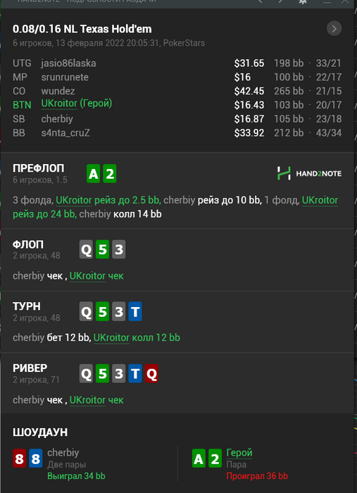 Jc 9h 3c 6с 8h, он ЧЕК, я ставлю 17,5ББ, он рейз до 52,5 и я после долгих раздумий - ПАС.