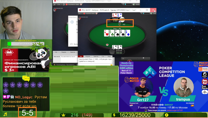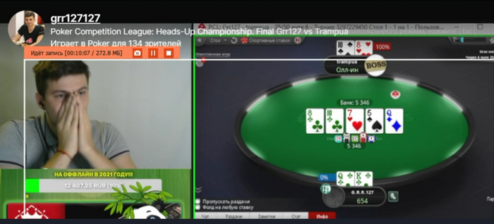 Когда с 2-5 камбэкаешь до 5-5 и выставляешься в решающей раздаче с двумя оверкартами (правда, как оказалось, овер-карты не играли) и флэш-дро, но не доезжаешь...