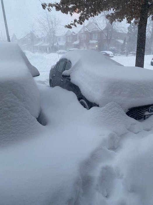 По телику сказали что у нас в Торонто это самый большой снегопад за последние 24 года. Всё это насыпало за часа 3-4. Почти все бизнесы в этот день не открылись. Водители городского траспорта побросали свои автобусы. Я же свою малютку не бросил, потому что чтобы что-то бросить по середине дороги туда нужно сначало выехать. А выехать я не смог даже со своей парковки.