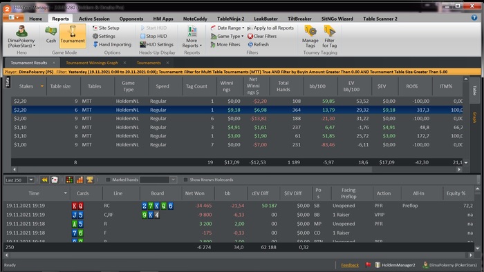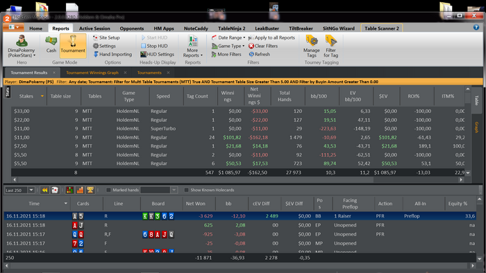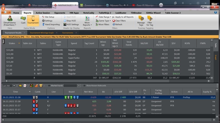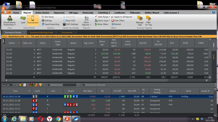 В общем немного расскажу как продвигаются мои дела)))Сразу на следующий день,после того как я написал пост,утром перед тем как поехать на работу включил комп но он поработав пару мин выключался.После манипуляций с системником и звонка другу сделал вывод,что полетел блок питания.Благо есть второй системник,староватый но есть.Дважды вылетал синий эран во время сессий ,но в целом сильно не отразилось.Ах,да-нашел базу свою на 500 туриков на системнике-я думаю она не очень-просто катал как хобби ,еще не приняв решение катать серьезно-поэтому мог позволить себе сделать каккую нить дичь)вот стата которую я нашел и стата за последнюю неделю-а точнее там два дня)Еще решил попробовать по возможности играть за 5.50 турнир хедзап.Т.к. считаю,что наигрыш и опыт есть в этой дисциплине, и учитывая кноки диспа большой не будет.посмотрим.пока график мтт(без хедзапов такой)