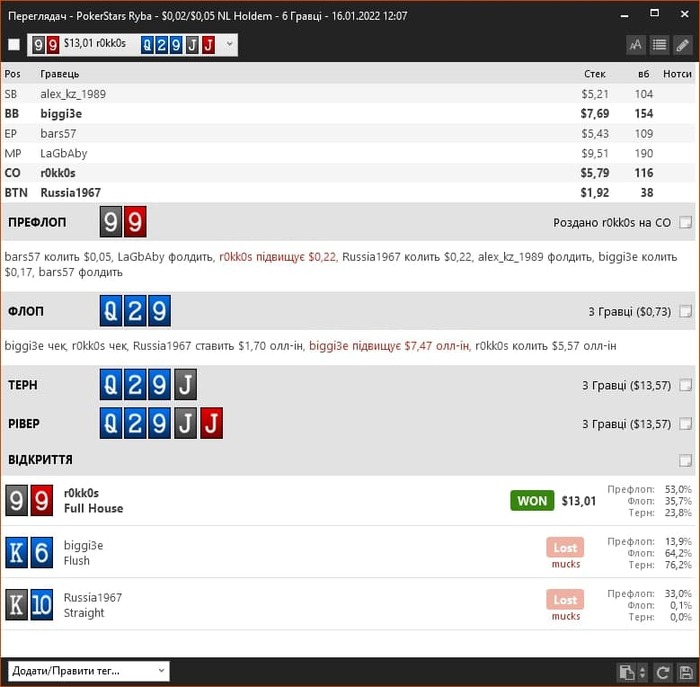 Оплачивали все мои доезды , да и перебор в 4.5стека это было круто . Надо повторить префлоп, надеюсь в ГТОвизард он не будет очень лузовый )