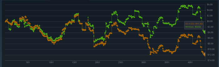 В общем неделя склалась удачно, за исключением двух дней, первый где после праздника , немного выпивший сел катать(разбирал те раздачи утром , то много ошибок не было, просто не склалось добрать с натсами и часто замазывался в сеты и стриты которые доезжали оппам ) и сегодня увидел такое , что за свою покерную *карьеру* не видел никогда. Столько грязи, столько коинфлипов , столько переездов у меня не было в итоге залил 9би но по ев в 0. Если б не откатал так плохо эту сессию , уже б переходил на нл10, а так надо откласть на пару дней.