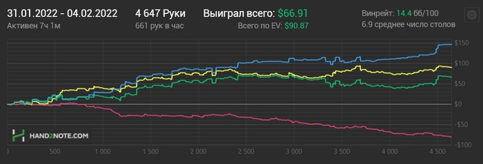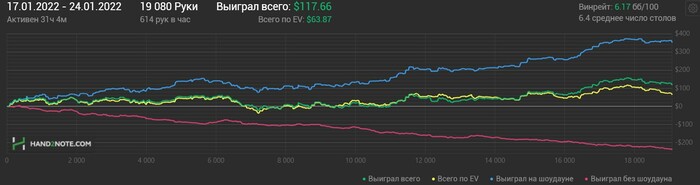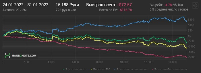 Не особо даже хочется делиться такими результатами. Вся неделя прошла по типу "первые час ухожу в жесткий минус , остальное время отбиваю его". Через небольшой тильт сыграл не так много раздач как хотелось бы. Больше добавить нечего, надеюсь эта неделя получиться объёмной и результативной.