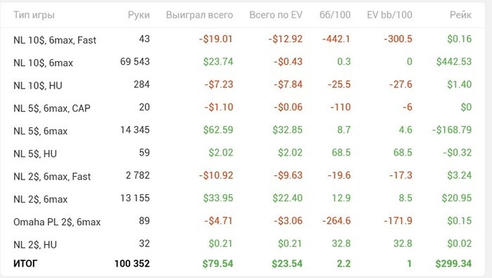 Сыграл немного, но более-менее качественно. Дошел до отметки в 100к раздач ✔️ Заработал 300$ за два месяца с учетом рейкбеков и лидербордов . Результатом мягко говоря недоволен. На нл10 творились дикие качели, надеюсь это был просто неудачный период , но если продолжиться такая тенденция, то выделю со своего скромного банкролла недорогого тренера.