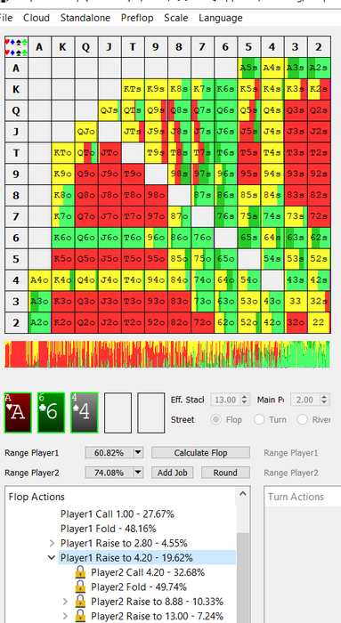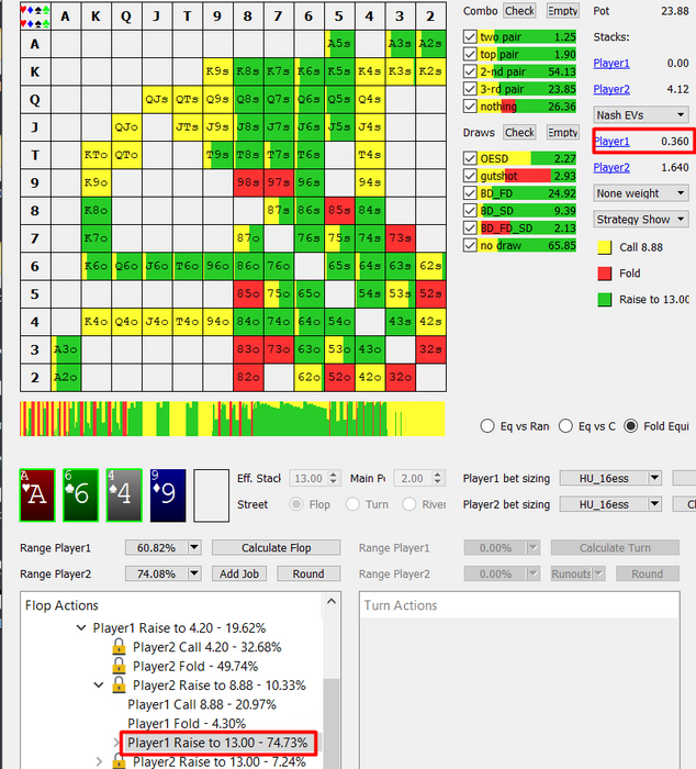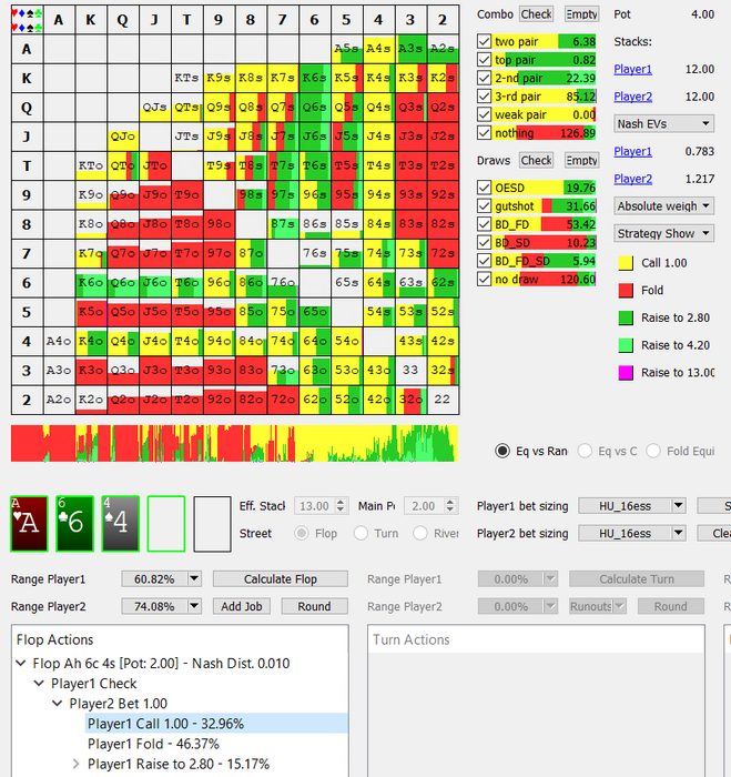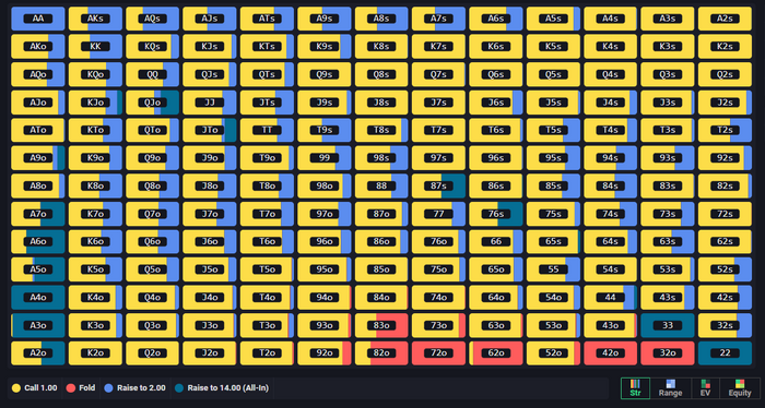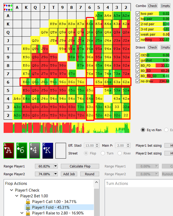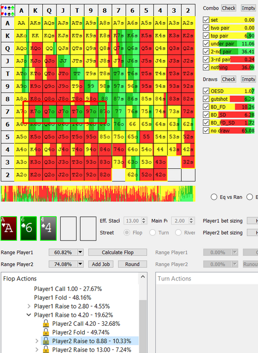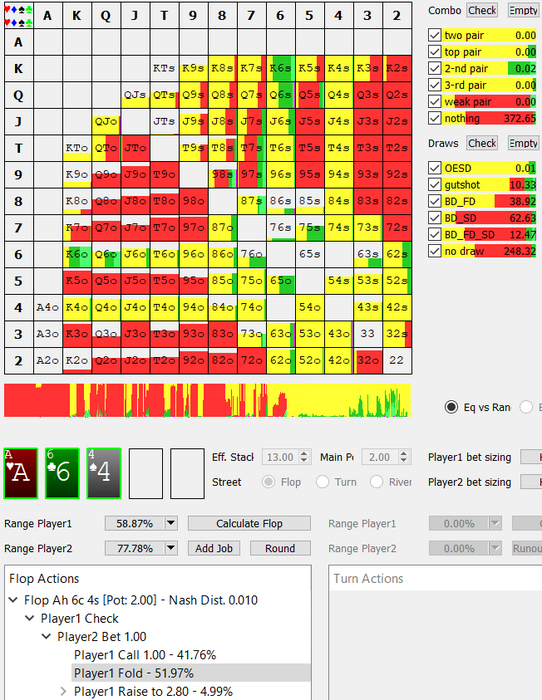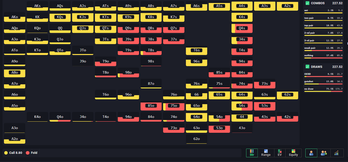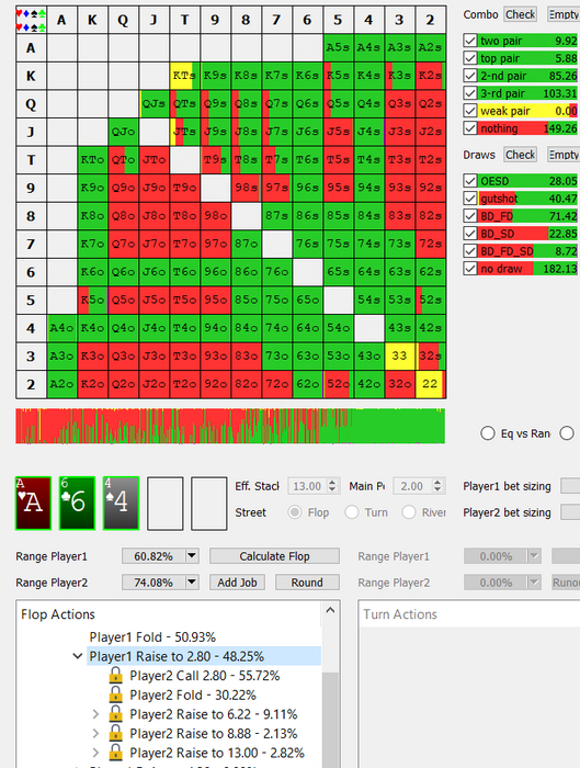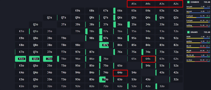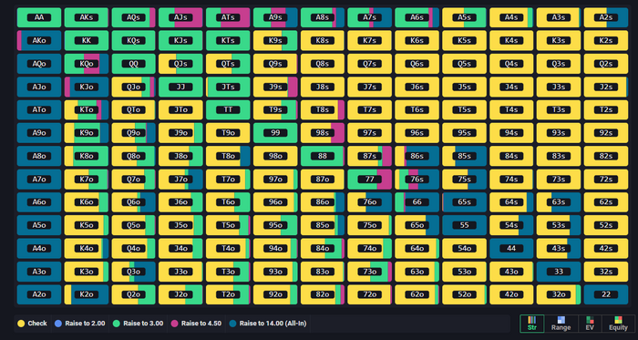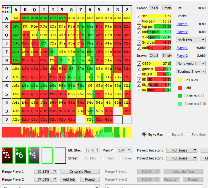 Комментарии о префлопе я назвал несущественными, потому что, даже если действительно убрать все Ах и 64 у ББ и добавить почти все тузы СБ, чекрейз все равно будет иметь смысл. Для того чтобы это продемонстрировать, зададим такой "абсурдный" префлоп диапазон в солвер и посмотрим на то, будет ли он строить Хr.