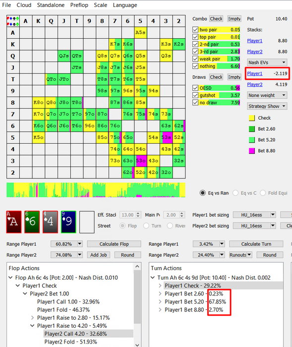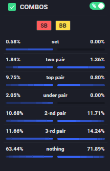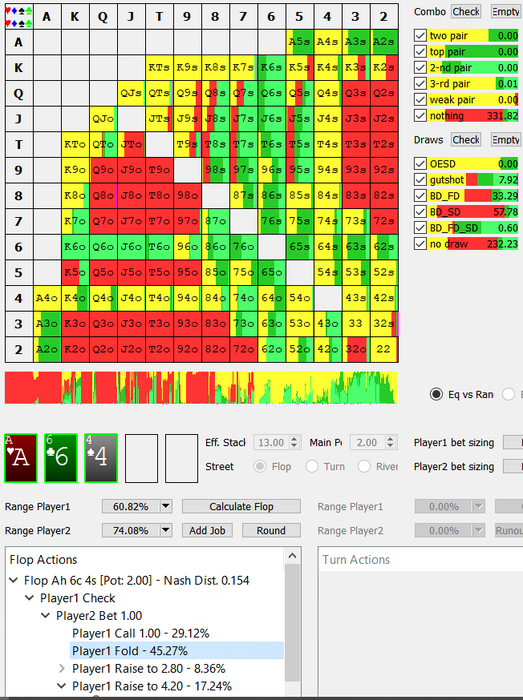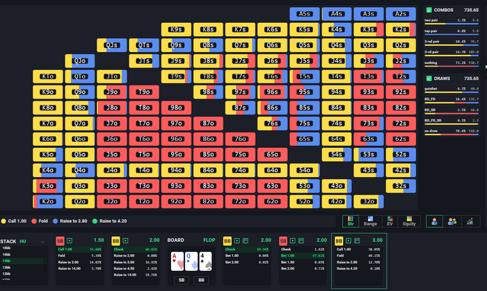 Для начала убедимся в этом, а потом попробуем разобраться почему машина не боится "развязывать руки оппоненту не чекрейзя ничего сильного". В примере я убрал возможность чекать и потбетить флоп СБ, хотя такая опция имеется по ГТО. На практике, 100% цбет, имхо, больше соответствует реалиям 5 лимита.