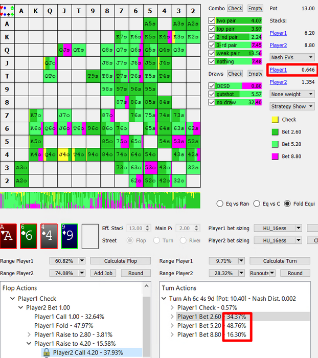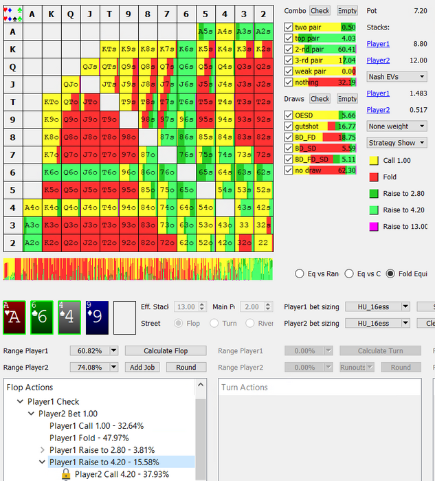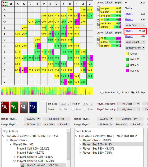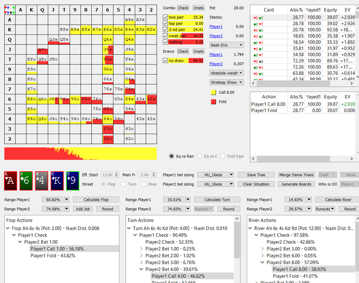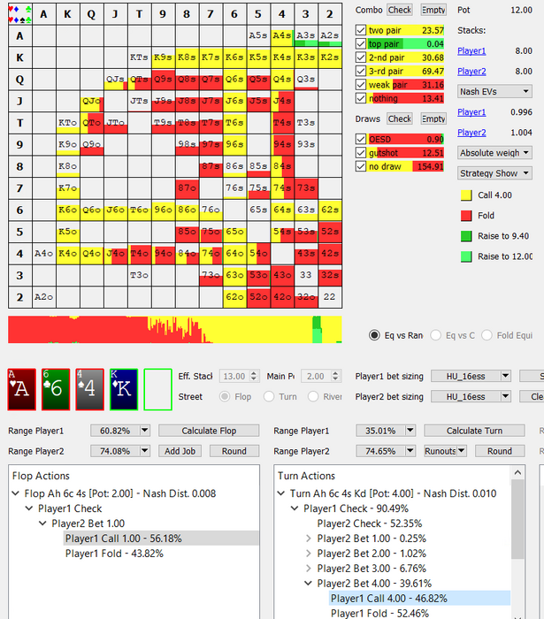 Для того, чтобы разобраться зачем это нужно, посмотрим что делают наши сильные вторые пары по линии Сall-Call-Call. Для этого я отрубил возможность Хr флопа. По хорошему, нужно проверять все возможные ранауты, но у меня не хватает Филомощностей . Поэтому, я буду проверять на бланковой оверке терна, которая будет выходить чаще всего и которая вылезла в нашей раздаче. Ривером тоже будут бланки, взятые с моей головы.