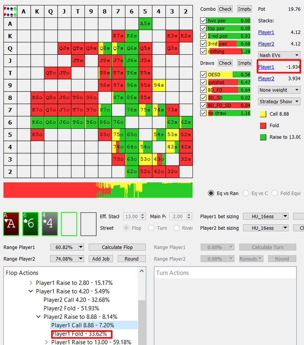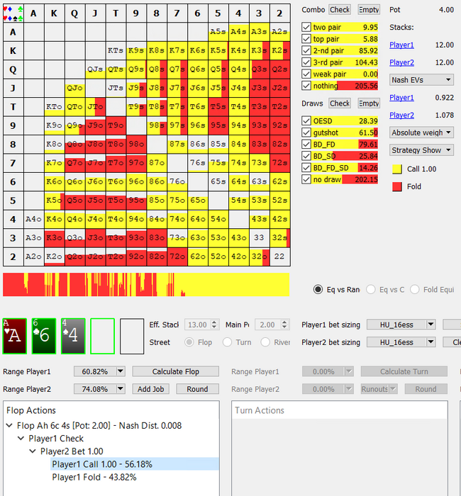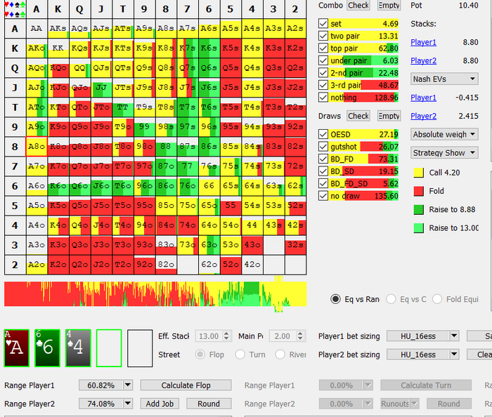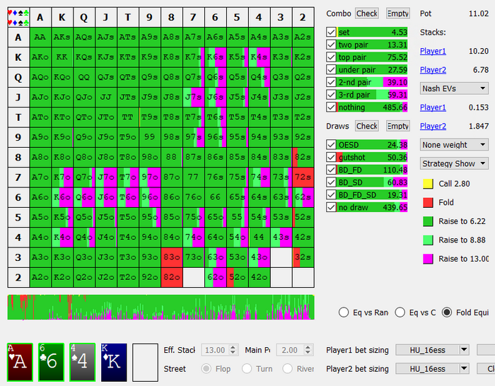 Подтверждение своим выводам нахожу и в том, что на доске AQ4 в таких же стеках, Xr с сильными вторыми парами уже миксится с колом, ев обеих линий примерно совпадает. Диапазон чекрейза строится скорее для ТП.