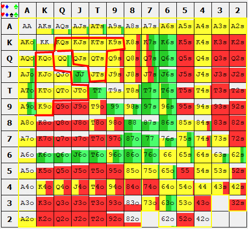 И так, частота действительно увеличилась. Теперь посмотрим, для каких групп рук строится Xr. Для этого нужно отметить те группы, которые чекрейзятся полным весом. Потому что в таком случае ЕВ Xr значительно выше ЕВ кола. А в ситуации когда возможен микс - ев обеих линий будет примерно совпадать. Также, нас интересуют только велью руки. Блефы добавляются исключительно ради велью и сами по себе индифферентны. Хотя иногда некоторые блефы тоже могут рейзится полным весом. Правда, скорее всего, это происходит из-за каких-то блокеров, а ЕВ обеих линий почти совпадает.